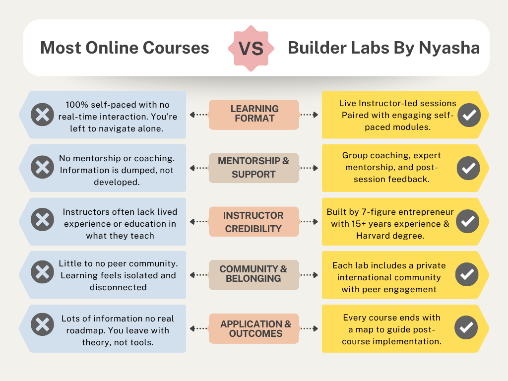 Builder Labs is designed to make learning clear, practical, and supportive from start to finish. Each course guides you step by step with a mix of live sessions, self-paced modules, mentorship, and community so you’re never left figuring it out alone.